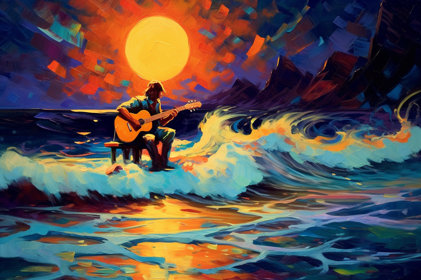 Ein einsamer Gitarrist am Strand mit schönem Farbspiel.