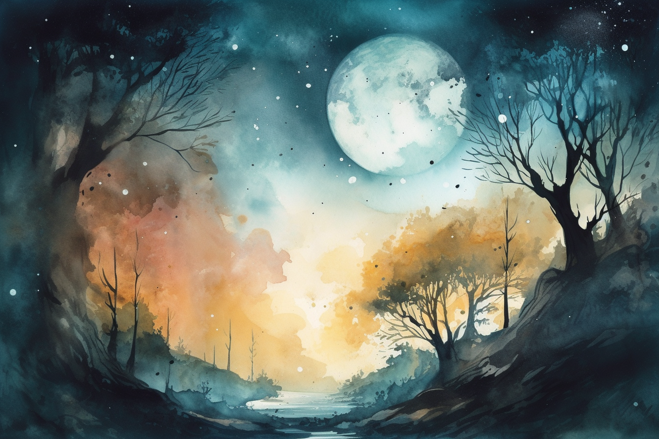 Stimmungsvolles Vollmond-Bild im Wasserfarben-Stil.
